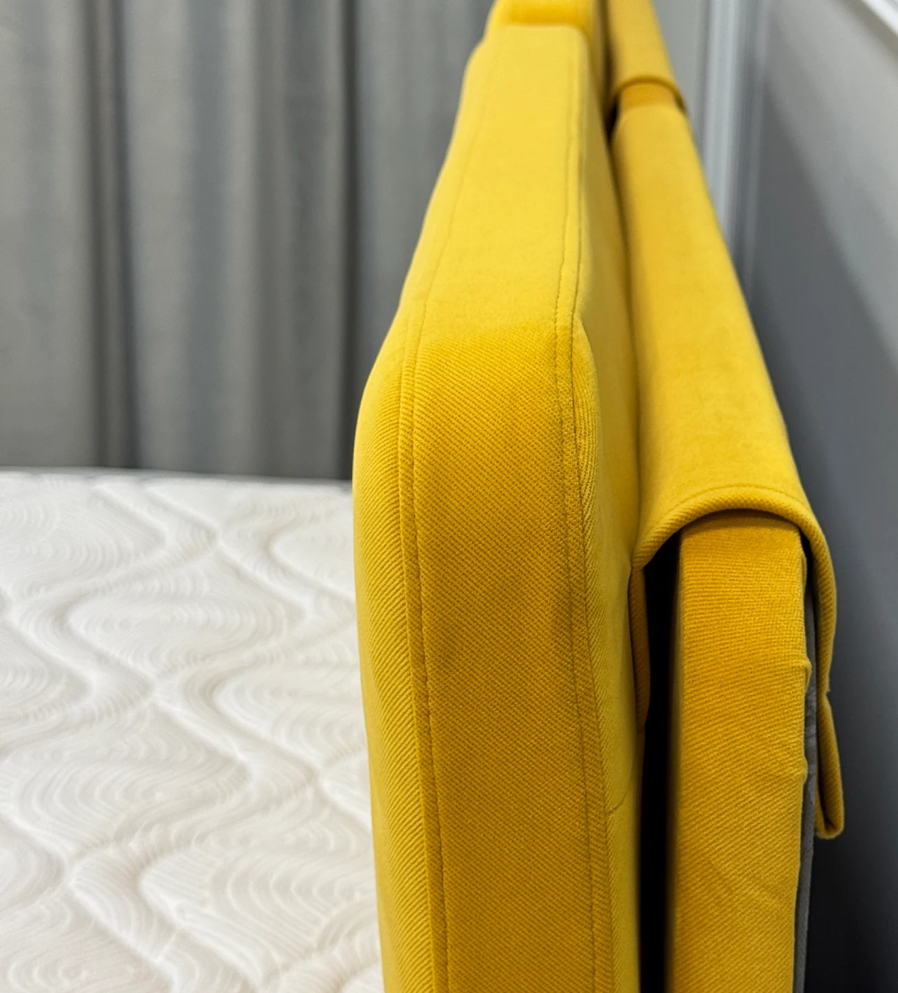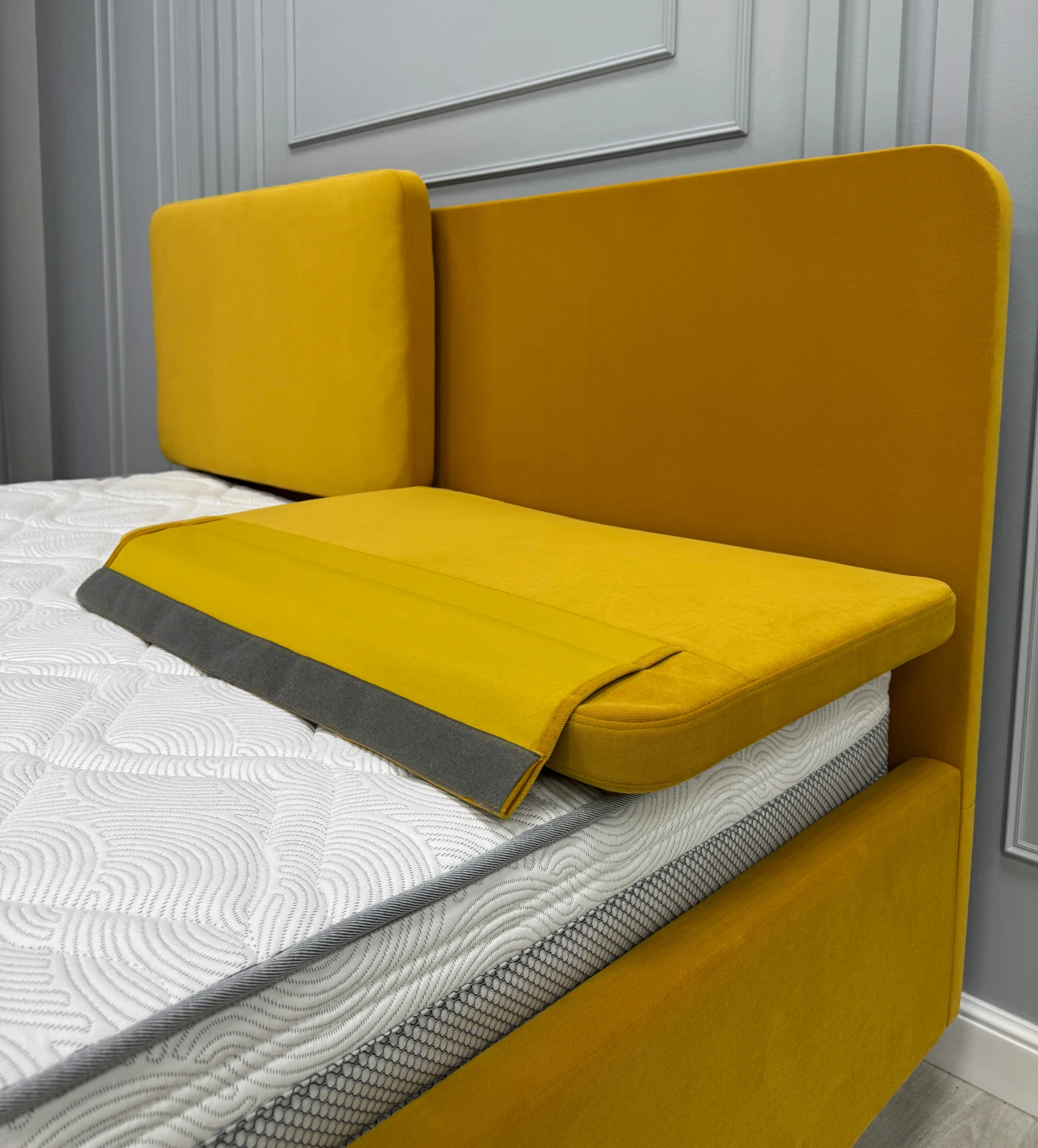 Подушки в данной модели изготовлены с использованием жесткого основания из МДФ с тыльной стороны для придания ей идеальной формы, что позволяет применять с фронтальной стороны сочетание пены и пышного слоя синтепона. Такое сочетание повышает комфорт спинки при ее эксплуатации в сидячем положении во время отдыха на кровати.