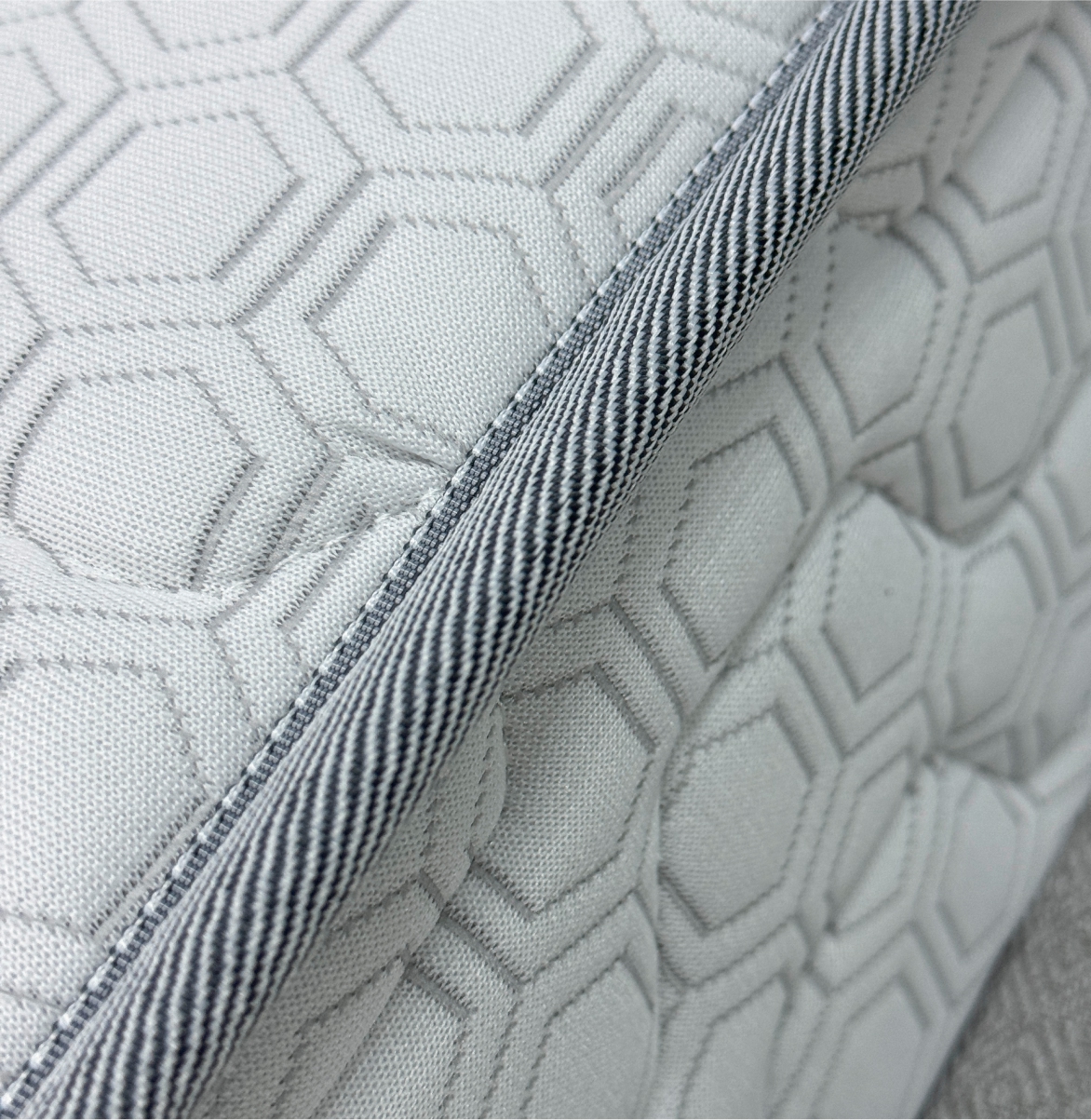 Трикотаж «Carbon» — современный и стильный материал с оригинальным рельефным рисунком «соты», который придаёт матрасу эффектный и премиальный вид. Высокая плотность ткани гарантирует её прочность и долговечность, а эластичная структура обеспечивает идеально ровное прилегание к наполнителю, сохраняя гладкость поверхности на протяжении всего срока службы. Материал обладает хорошей воздухопроницаемостью, что помогает поддерживать комфортный микроклимат во время сна, и устойчив к износу, сохраняя свой внешний вид даже при длительной эксплуатации
