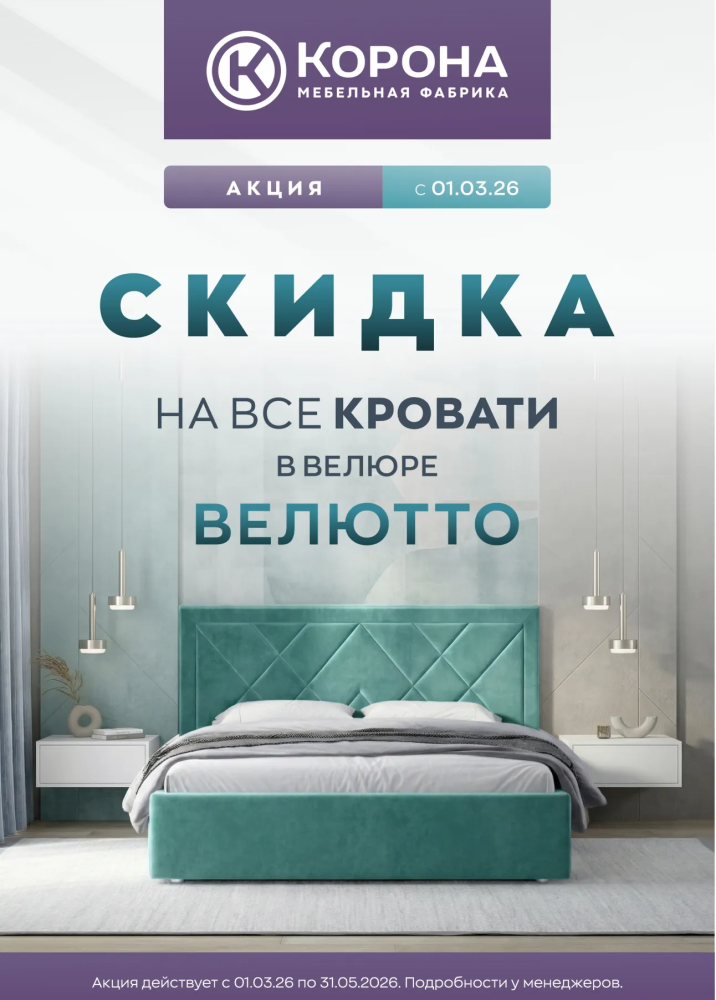 • Скидка распространяется на все кровати ТМ «Корона» в ткани «Velutto»